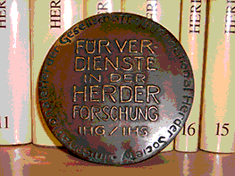 Die Herder-Medaille der Internationalen Herder-GesellschaftSeit 2004 verleiht die Internationale Herder-Gesellschaft für Verdienste in der Herder-Forschung die Herder-Medaille. Gerhard Sauder, dank dessen Bemühungen dieser Preis Gestalt annehmen konnte, beschreibt, gebeten vom Vorstand der Gesellschaft, seine Entstehung: *** Die Konferenz der IHS/IHG des Jahres 2000 fand in Weimar statt und wurde von Regine Otto (1936 – 2008) und John H. Zammito veranstaltet. Sie stand unter dem Leitthema „Vom Selbstdenken“. Zum erstenmal sollte ein Mitglied der Gesellschaft für Verdienste in der Herder-Forschung ausgezeichnet werden. Konsens herrschte darüber, dass Hans Dieter Irmscher (1929 – 2009) der erste Preisträger sein sollte. Wegen Krankheit konnte er nicht nach Weimar fahren. So wurde er in absentia geehrt. Die Form war allerdings asketisch: John H. Zammito verlas den kurzen Text der Ehrung, der auf eine Pergament-Imitation geschrieben war und dem Geehrten dann mit der Post zugestellt wurde. In informellen Gesprächen waren sich die meisten Mitglieder darüber einig, dass eine 'würdigere' Form für diese Auszeichnung gefunden werden sollte. Aber bei der Konferenz von 2002 (Houston), die John H. Zammito ausrichtete, blieb es bei dem bisherigen Ritual – geehrt wurde Frederick Barnard (1921 – 2011), der – nach meiner Erinnerung – ebenfalls nicht anwesend sein konnte. Als damaliger Vizepräsident fand ich die Zustimmung Johns und anderer Mitglieder, dass ich mich für die nächste Tagung der Gesellschaft um eine Medaille bemühen sollte. Ich bin kein Medaillen-Kenner und kein Numismatiker. Auf der Suche nach einer Möglichkeit der Realisierung des Vorhabens erinnerte ich mich an die freundliche Hilfe, die mir bei der Jahrestagung der „Deutschen Gesellschaft für die Erforschung des achtzehnten Jahrhunderts“ (21. - 23. November 1984) über Herder in Saarbrücken vom damaligen Dekan der Philosophischen Fakultät, Prof. Dr. Peter Robert Franke, zuteilwurde. Er ist Althistoriker und einer der renommiertesten Numismatiker der Gegenwart. Zur Eröffnung der Tagung hielt er einen kurzen Vortrag über Herder-Porträts und -Medaillen. Inzwischen lebt er als Emeritus in München – ihm habe ich die Bekanntschaft mit Prof. Hubertus von Pilgrim (Pullach), dem Bildhauer, Grafiker und Medailleur, zu danken. Seit dem 15. Januar 2004 wurden zwischen Pullach und Saarbrücken Briefe und E-Mails über die geplante Herder-Medaille gewechselt. Dabei musste auch ‚übers Geld‘ geredet werden – einige Mitglieder rieten vom Medaillen-Projekt ab, falls die Finanzierung über die Mitgliedsbeiträge erfolgen sollte, die ja nahezu völlig für das Jahrbuch und andere Veröffentlichungen benötigt wurden. Ich ging das Risiko ein, die Medaille (zehn Exemplare) nur mit einzuwerbenden Spenden zu finanzieren. Hubertus von Pilgrim habe ich Kopien von Herder-Porträts geschickt. Er wollte sich angesichts der erstaunlichen Fülle der Herderschen Porträtüberlieferung nicht auf eine Porträtversion festlegen. Die ausgeprägte Physiognomie der reiferen Zeit, das „feste Fleisch“, reizte ihn besonders: „das Konterfei muß schon reif, füllig, sehr plastisch ausfallen.“ (v. Pilgrim, 23.1.2004) Über die Beschriftung entschieden Mitglieder der Gesellschaft – die noch lebenden ‚Gründungsmitglieder‘ und verdiente Herder-Forscher wurden um ihre Vorschläge gebeten. Für die Vorderseite mit dem Halbprofil Herders, der wie aus einem Fenster in die Gegenwart blickt, wobei die Bäffchen des Geistlichen ironisch über den Rahmen hängen, wurde die Umschrift „Humanität ist der Zweck der Menschennatur“ gewählt. Unter dem Rahmen befindet sich links Herders Namenszug und am unteren Rand die Jahreszahl „2004“. Die Rückseite der Medaille nennt ihren Anlass: „Für Verdienste in der Herder Forschung. IHG/IHS“. In der Umschrift werden der deutsche und der englische Name der Gesellschaft ausgeschrieben. Hubertus von Pilgrim hatte vorge-schlagen, auf der Rückseite den Namen des/der Geehrten einzugra-vieren. Die befragten Mitglieder rieten davon ab. Während der Künstler nach einem Gießer suchte, der zunächst nur ein Exemplar herstellen sollte, ging die Einwerbung von Spenden weiter – sie war mit mancher Enttäuschung verbunden. Erst als die Finanzierung gesichert war, konnte ich „grünes Licht“ für den Guss geben: Mitte Juli wurde die Medaillen-Urform in Eile nach Verona in die Gießerei geschickt. Ein Exemplar erhielt ich gerade noch rechtzeitig vor Beginn der Saarbrücker Tagung: Die erste Herder-Medaille wurde bei der abendlichen Mitglieder-Versammlung am 15. August 2004 Wulf Koepke (1928 – 2010) überreicht – er wurde als Gründungs-Mitglied und heraus- ragender Herder-Forscher geehrt. Am 18. November 2004 wurden mir die noch fehlenden Exemplare zuge-stellt. 2006 wurde Ulrich Gaier bei der Tagung in Madison/Wisconsin, 2008 Günter Arnold bei der Konferenz in Jena, 2010 Ernest A. Menze in Notre Dame und 2012 Hans Adler (in absentia) in Rheinfelden/Basel mit der Medaille geehrt.